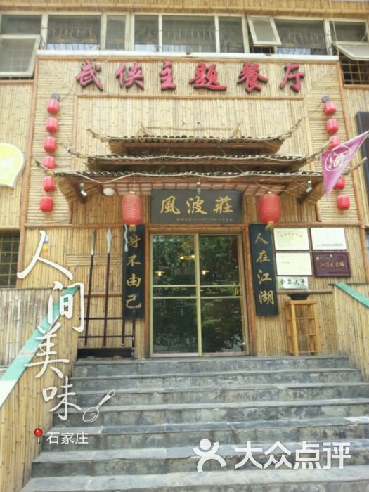 门头:材质优先选防腐木+复古铁艺,颜色选深棕色+红色(江湖气息),门头正中央要突出“风波庄”三个大字(建议用木质雕刻),下方可加一句“有人就有江湖,有江湖就有风波庄”-
