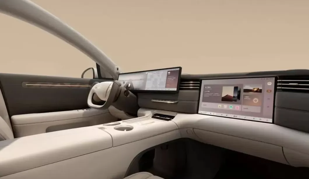 变化最大的还是车内的智能系统。全新智己 LS6 换了新的布局,把之前的一体式大联屏改成了分屏,用了 27.1 英寸 5K MiniLED 屏和 15.6 英寸 3K MiniLED 副驾娱乐屏的组合。前面的屏幕改成了悬浮式,还取消了升降功能;副驾的屏幕是独立的,嵌在中控台里。