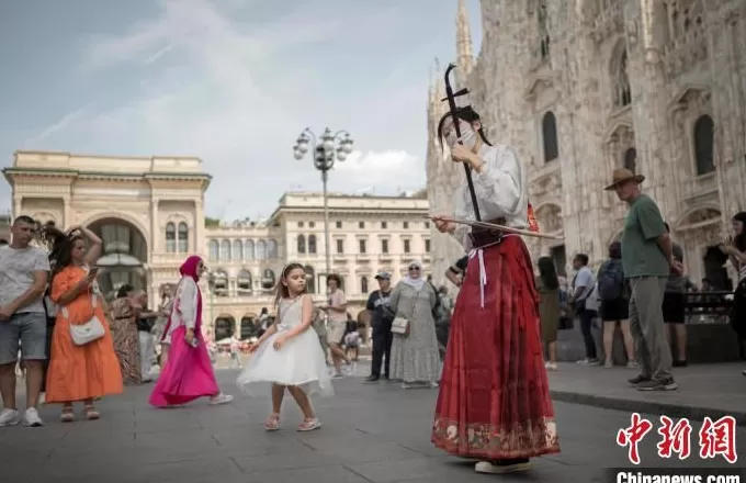 来自山东潍坊的郑晓慧身穿马面裙在意大利米兰街头演奏二胡。(郑晓慧供图)
