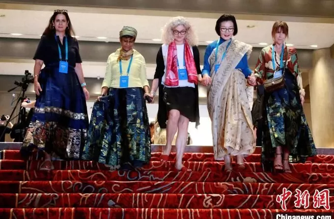 2024年7月10日,山东曲阜,周锦(右二)和外宾们身着中国传统服饰马面裙出席第十届尼山世界文明论坛开幕式。中新社记者 梁犇 摄