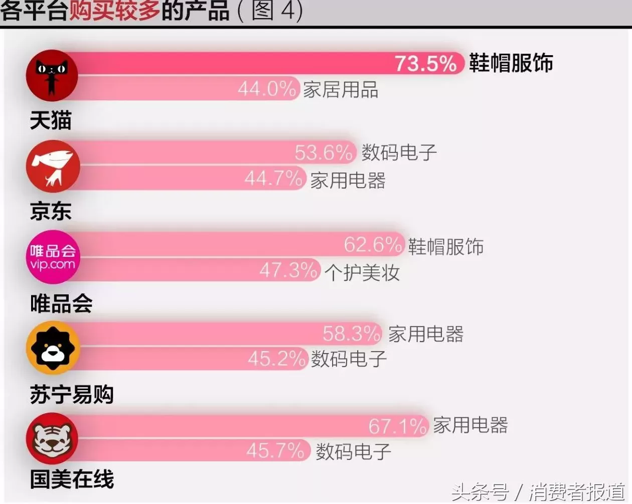 消费者在天猫、唯品会这两个平台主要购买的产品为鞋帽服饰。而在京东、苏宁易购、国美在线的这三个平台主要购买的产品均为家用电器、数码电子。
