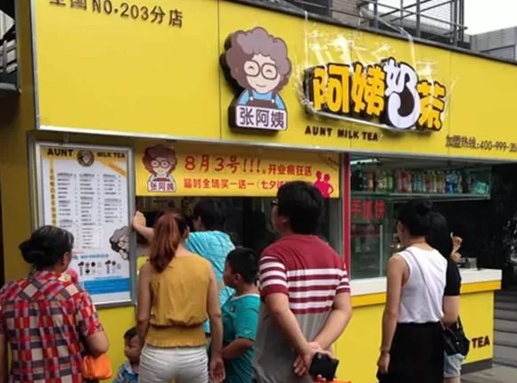 第二,卡通呆萌派。 奶茶店多用卡通人物形象和名字作为奶茶店名,可爱亲民又极具趣味,是这种类型的奶茶店特征。我们容易被这种具体的形象吸引,并且勾起我们本有的童心。例如超级奶爸奶茶,用一个老实强壮的奶爸形象获得很好的粉丝缘。除此之外,还有张阿姨、茶桔便、奶茶博士等。这样的奶茶店特别能受学生的欢迎,如果选址在学校附近,保准能带来好效益。