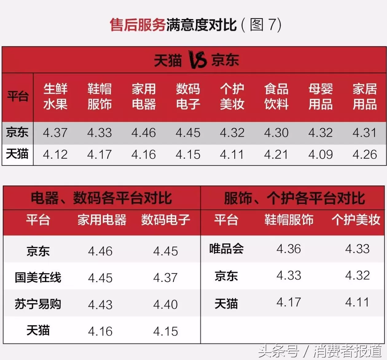 产品质量满意度对比: 京东整体优于天猫,苏宁在电器类表现最佳