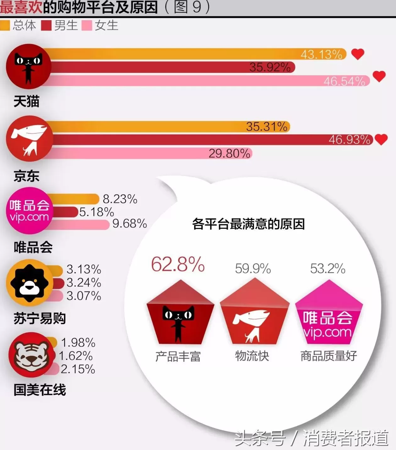 总体购物体验满意度中,消费者对天猫、京东两个平台的满意度相近。但问及最喜欢的平台中,天猫得票率最高。根据性别进行划分,则男生最喜欢的平台是京东,女生最喜欢的平台是天猫。分析喜欢该平台的具体原因得出,天猫因商品丰富度高取胜,京东最满意的还是物流,而唯品会则为商品质量好。