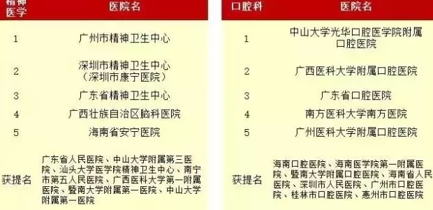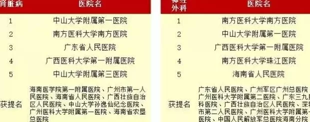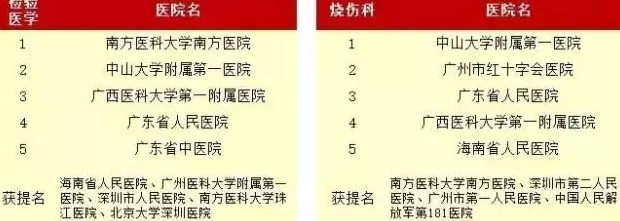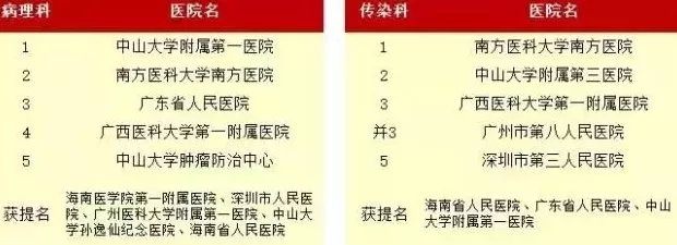 南方医科大学南方医院 (病理科、传染科、肾脏病、血液学、整形外科)与广东省人民医院 (放射科、心血管病、心外科、老年医学、急诊医学)各有5个专科 进入 全国前十。