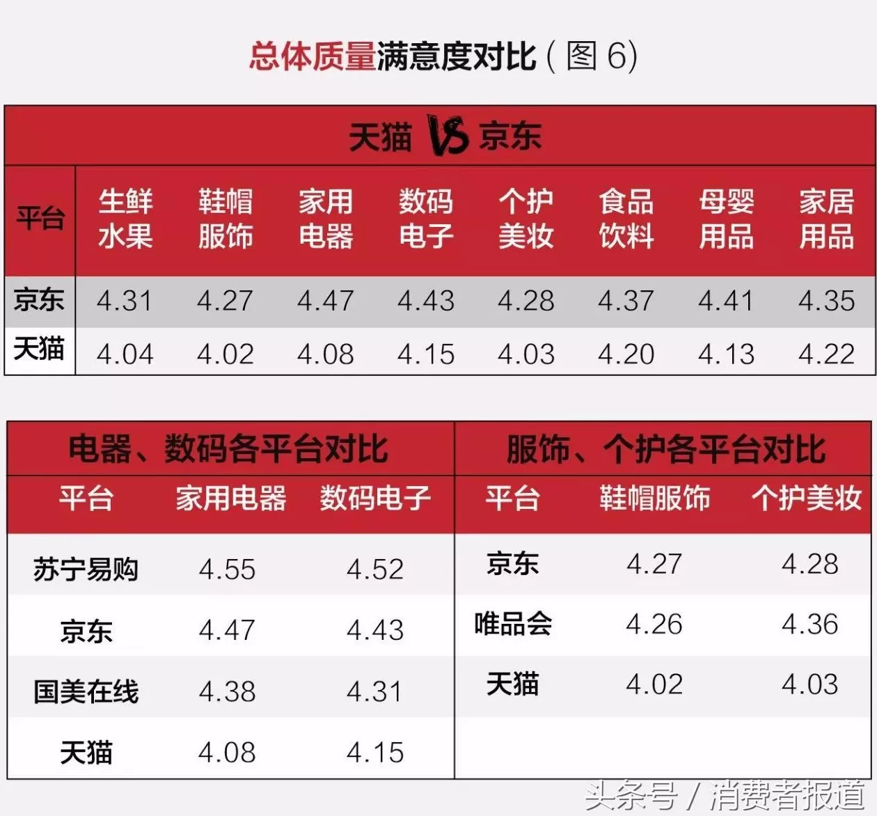产品质量满意度对比: 京东整体优于天猫,苏宁在电器类表现最佳