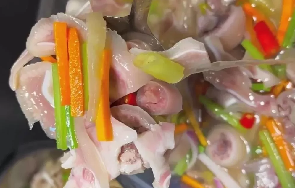 解读:用泡菜汁泡这些荤菜时,首先要把它们泡去血水,不然泡出来出品会发黑。而且要把它们煮断生的同时,也要把腥味去掉,煮好的这些食材都要马上放冰水里过凉,控干水分才能泡。