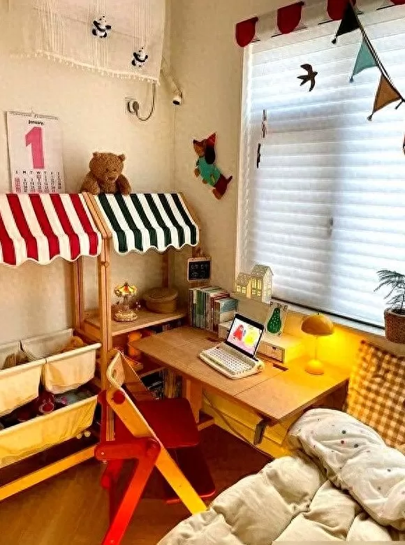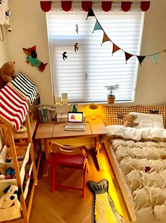 儿童房只有7㎡,她让木工把床抬高30厘米,下面塞下8个抽屉,换季被子全装走。