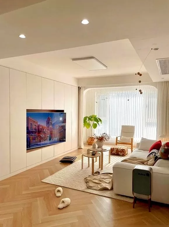 进门整墙暖白柜,电视嵌中间,杂物全隐身,门一关像样板间。