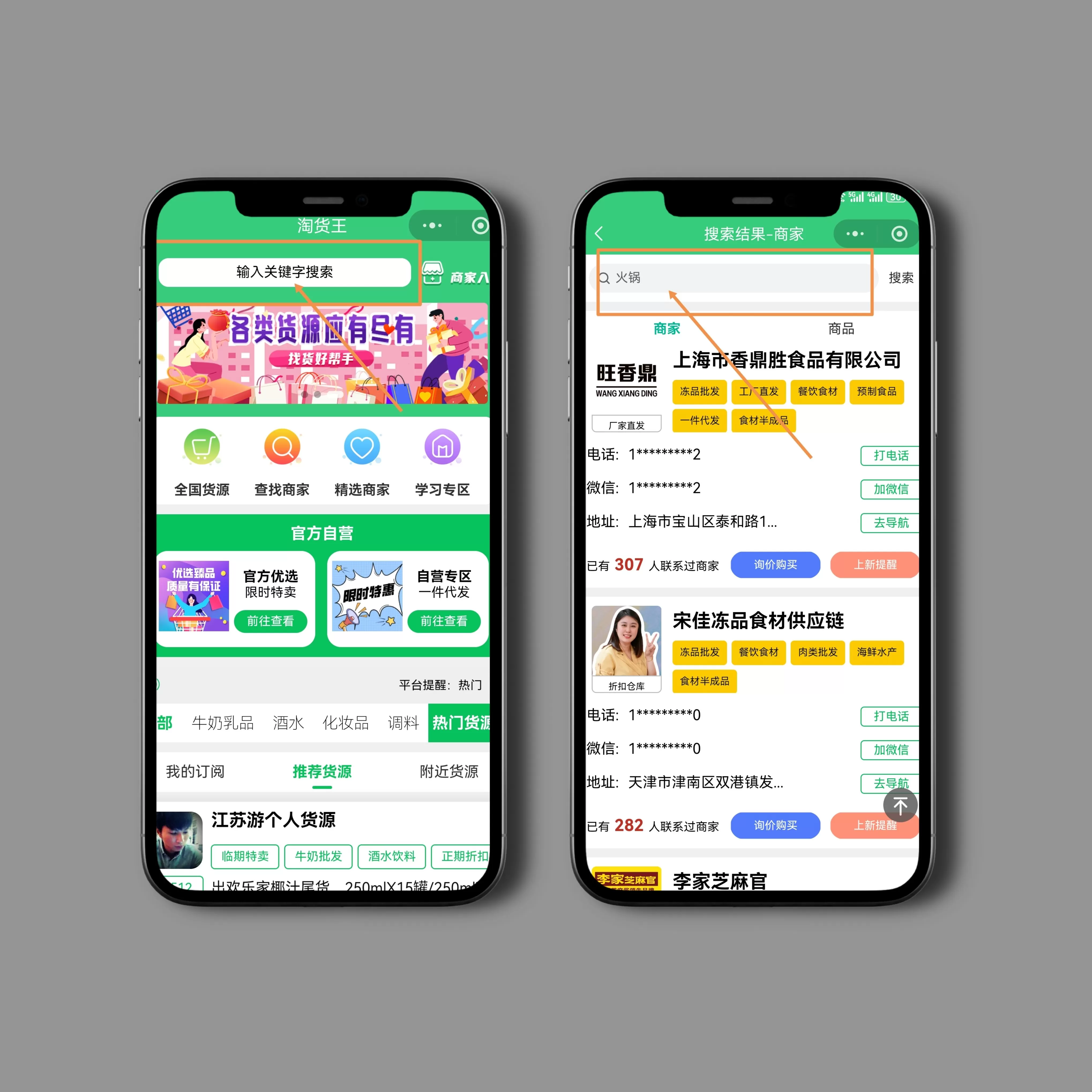 我们先要找到淘货王,我们用微信直接搜淘货王进入小程序即可,然后在其首页搜索框直接搜“火锅”,进去之后会出现一堆供货商。