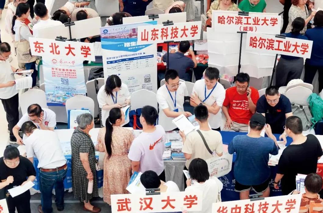 2024年6月27日,山东烟台市的一场高考招生咨询会上,近百所高校的招生人员与考生和家长面对面交流。图/IC