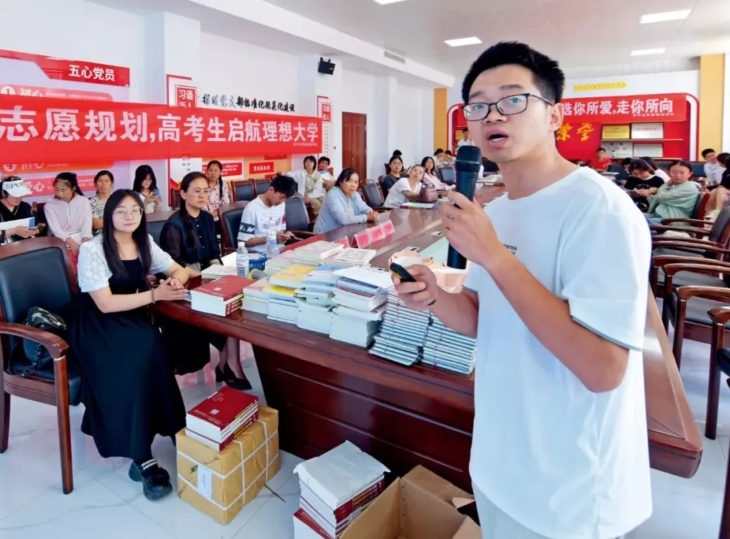 2024年6月12日,山东聊城市茌平区贾寨镇,茌平区选调生(本科天津大学化工专业,研究生复旦大学计算机专业)贺鲲鹏在耿店新村党群服务中心给大家分享化工专业、计算机专业及转专业的心得体会。图/IC