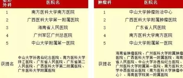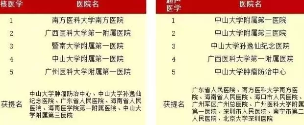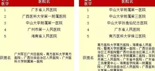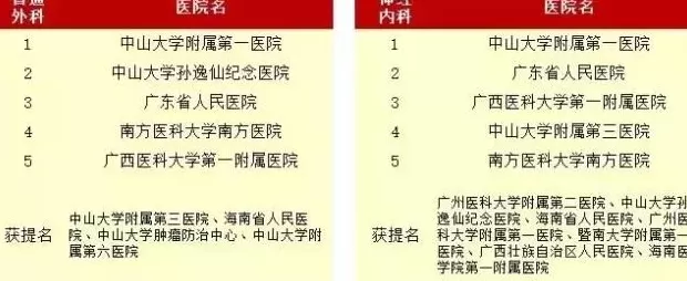 南方医科大学南方医院 (病理科、传染科、肾脏病、血液学、整形外科)与广东省人民医院 (放射科、心血管病、心外科、老年医学、急诊医学)各有5个专科 进入 全国前十。