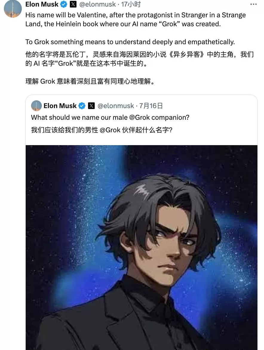 近日, xAI 的 AI 聊天机器人 Grok 上线了 AI 伴侣功能。而在昨日,马斯克发文称,将在该 AI 伴侣功能中添加第三个角色——AI 男友。