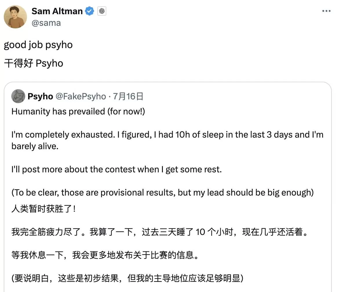 消息一出,连 OpenAI CEO Sam Altman 都亲自转发了,并配文「干得好,Psyho!」