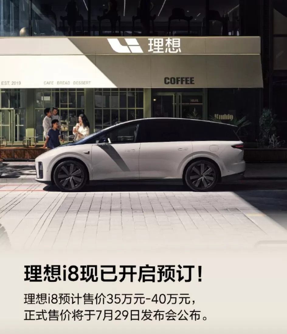 7 月 17 日,理想 i8 开启预订,同步公布了预计售价:35 万元至 40 万元。新车将于 7 月 29 日正式发布,届时还将公布正式价格。