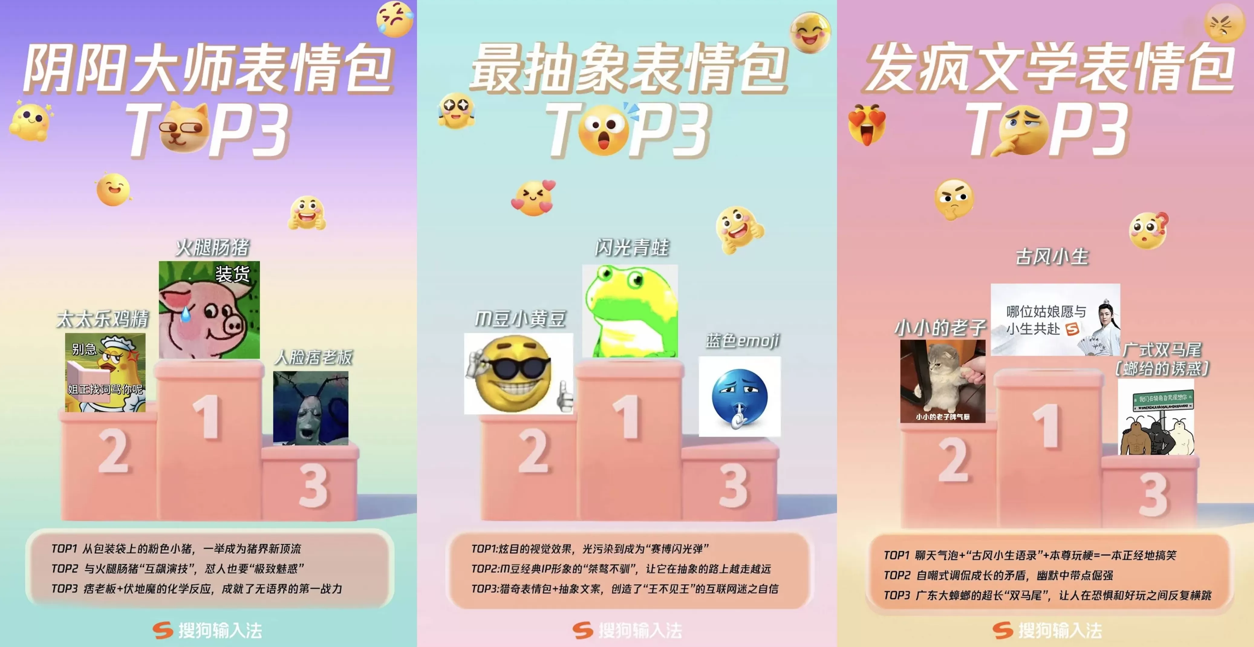 最抽象:闪光青蛙、m 豆小黄豆、蓝色 emoji 上榜,其中闪光青蛙凭借「亮瞎眼」的 HDR 效果,成为了「赛博闪光弹」;阴阳**表情包:火腿肠猪、太太乐鸡精、人脸痞老板全部上榜。发疯文学表情包:古风小生、「小小的老子」小猫、广式双马尾「螂给的诱惑」表现稳定,登上前三。搜狗输入法方面表示,2025 上半年,表情包再次化身时代情感的简笔画——它们不只是符号堆叠,更是群体情绪的像素显影,刻录着欢笑、吐槽、困惑与自嘲的每一帧。「众声喧哗的年代,表情包正升级为一种独特的生存修辞术。」