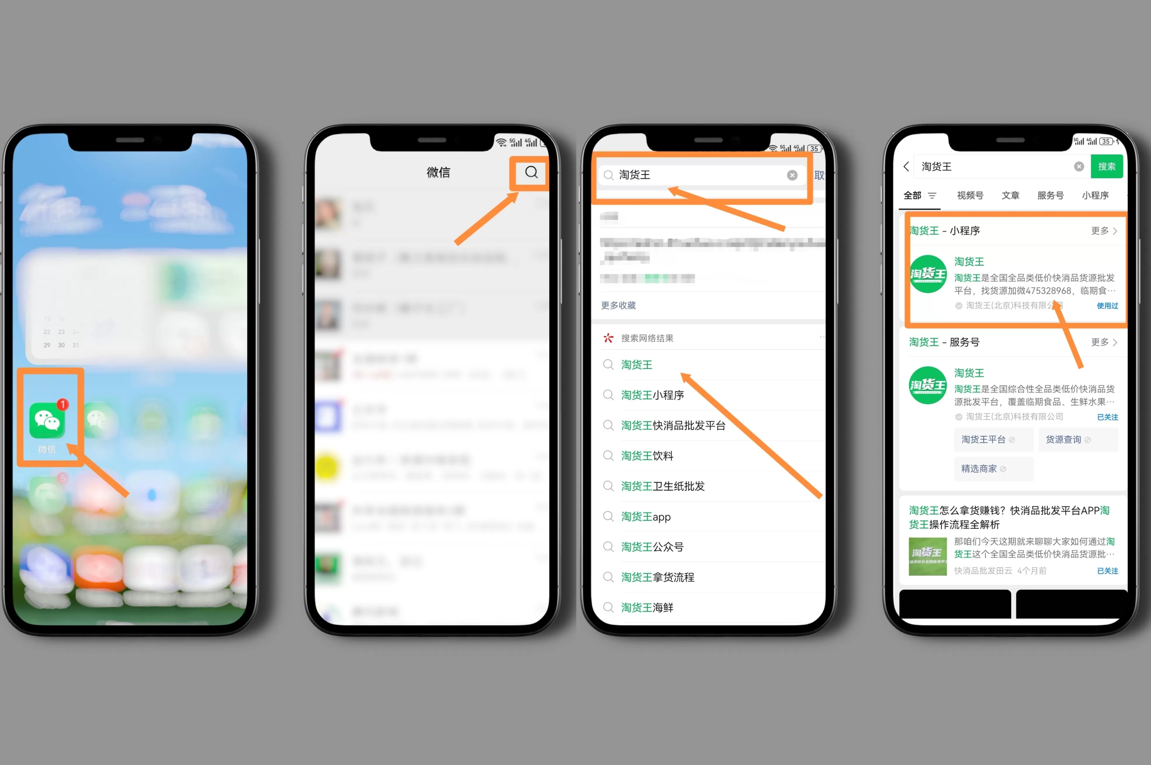 我们先要找到淘货王,我们用微信直接搜淘货王进入小程序即可,然后在其首页搜索框直接搜“火锅”,进去之后会出现一堆供货商。