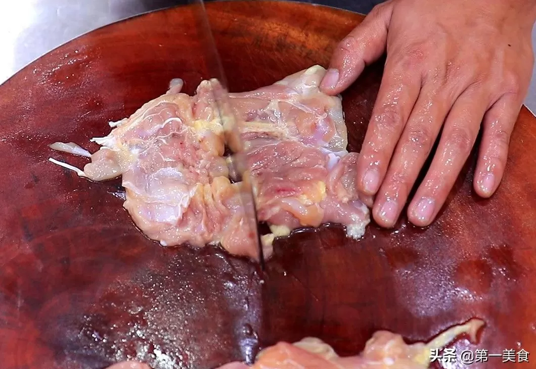 准备鸡腿两个 ,用剪刀剪掉鸡皮,剔出里面的骨头 ,把鸡肉洗干净用刀背把鸡肉的正反面都拍一拍,把里面的纤维拍散,这样腌制的时候会更加入味 。