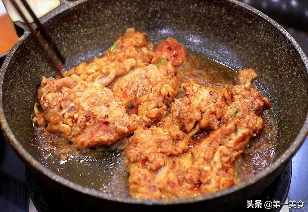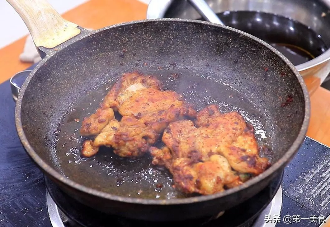 锅内烧油,滑好锅以后,倒出热油加入凉油 ,油温升至5成热 时,把腌好的鸡肉平铺在锅中 ,开小火慢慢煎 ,经常用筷子翻面这样受热更加均匀。