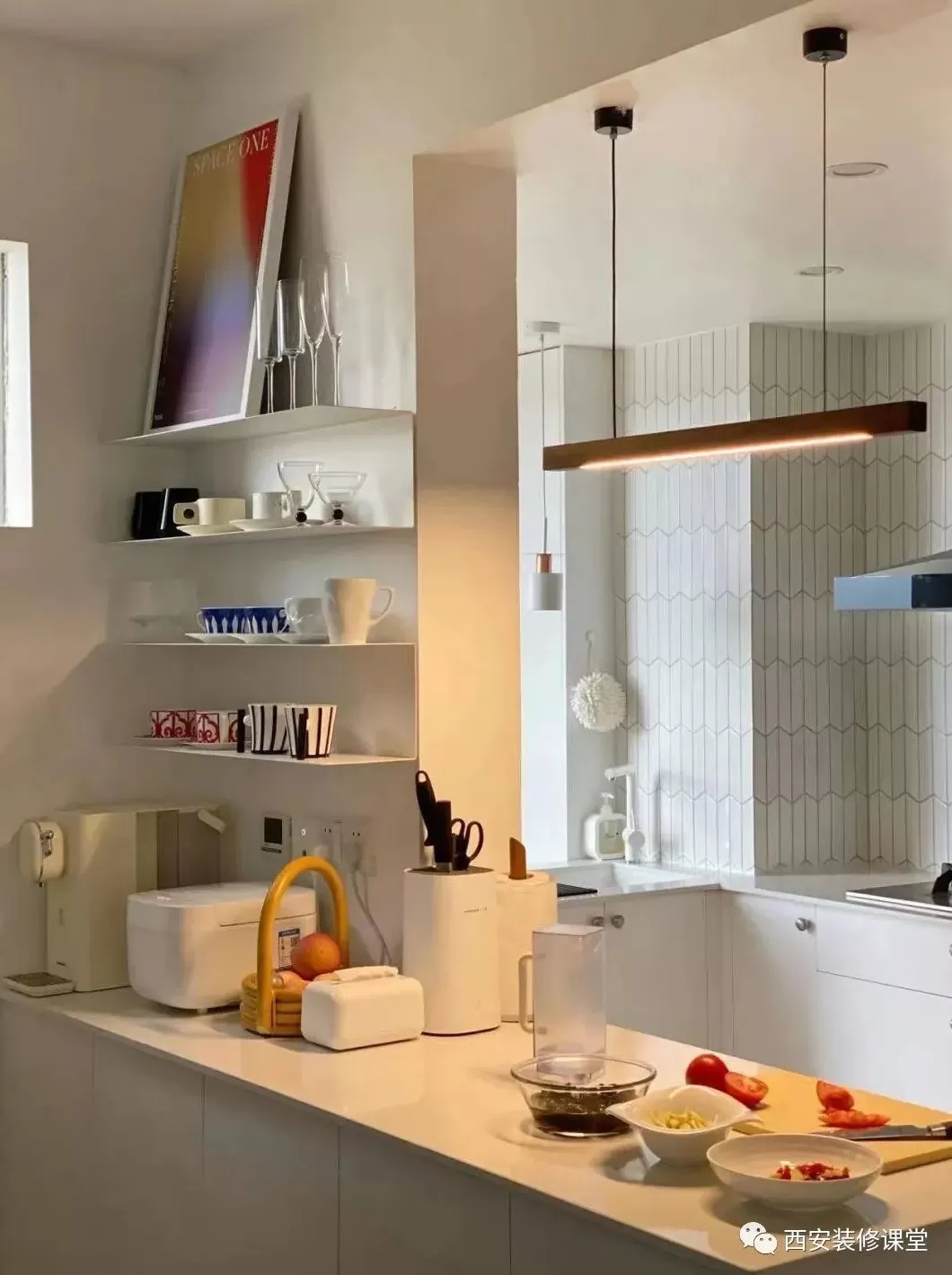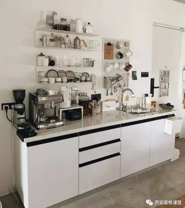 ▲如果只是地柜的收纳和台面储物,后期可以利用洞洞板充分利用垂直墙面,专门用来收纳杯子各种零碎,搭配隔板储物,也是非常方便而且简单的做法