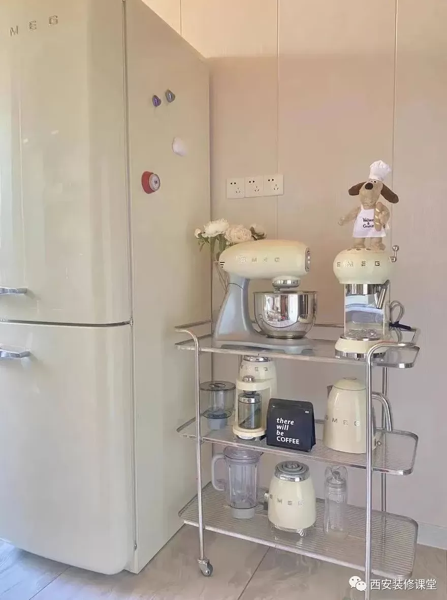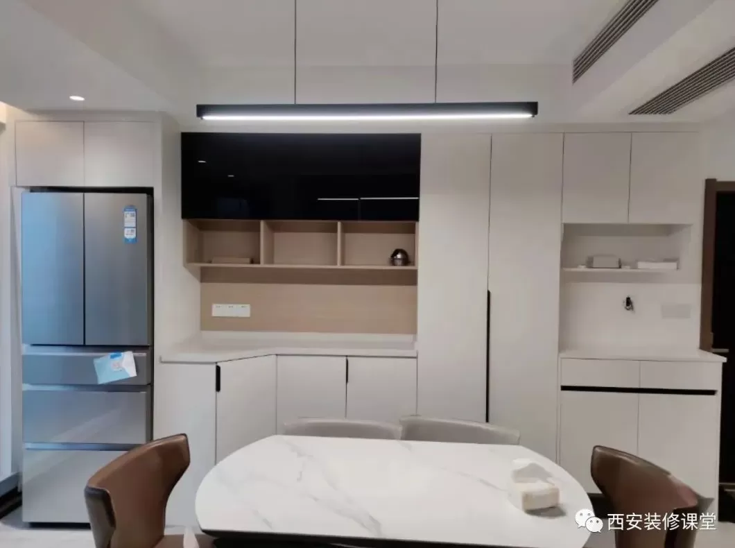 ▲如图成品的斗柜满足水吧台的功能,同时视觉上弱化一下冰箱的突兀感