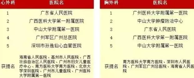 南方医科大学南方医院 (病理科、传染科、肾脏病、血液学、整形外科)与广东省人民医院 (放射科、心血管病、心外科、老年医学、急诊医学)各有5个专科 进入 全国前十。