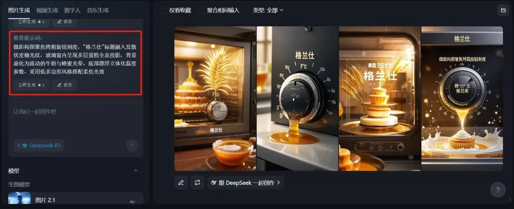 现在我们换一种方式,利用“DeepSeek R1”生成关键字后再出图,我们会发现优化后的关键字变得丰富了。