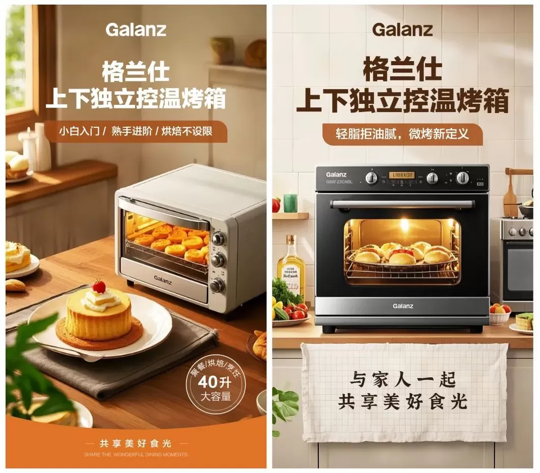 (参考图)格兰仕烤箱产品海报:主标题:“乐享烘意”,副标题:趣烤好滋味。