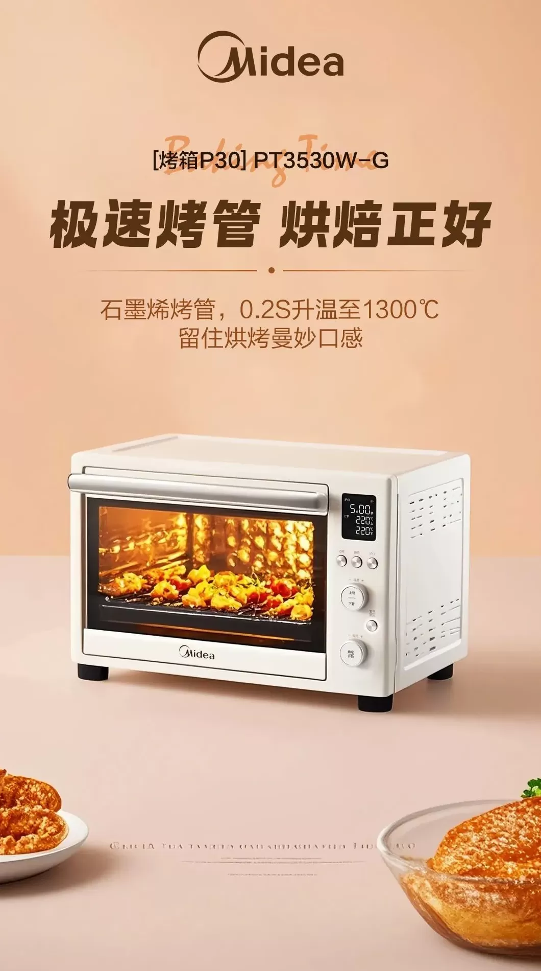 画面主体是一个格兰仕烤箱,设计简约时尚,烤箱放置在橱柜上。