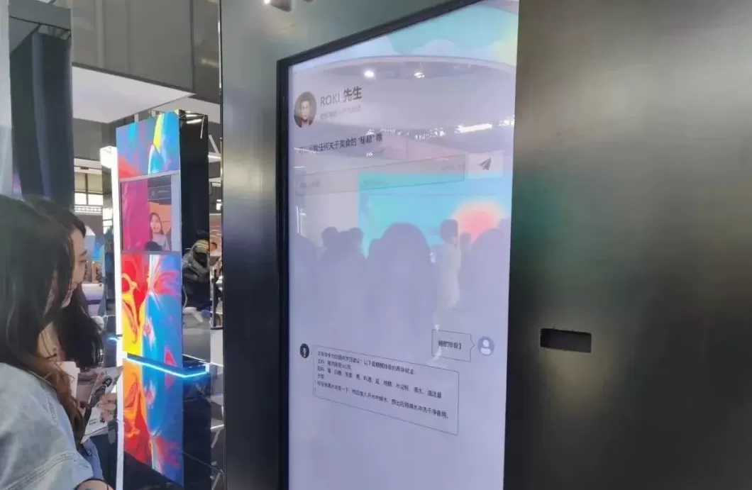 在老板电器展台,有观众输入“糖醋排骨”,屏幕即时显示烹饪方法。在本届AWE上,老板电器推出ROKI数字厨电创造者i7,烟机上装有6.86寸的中控彩屏,AI自动烹饪的过程实时可见。