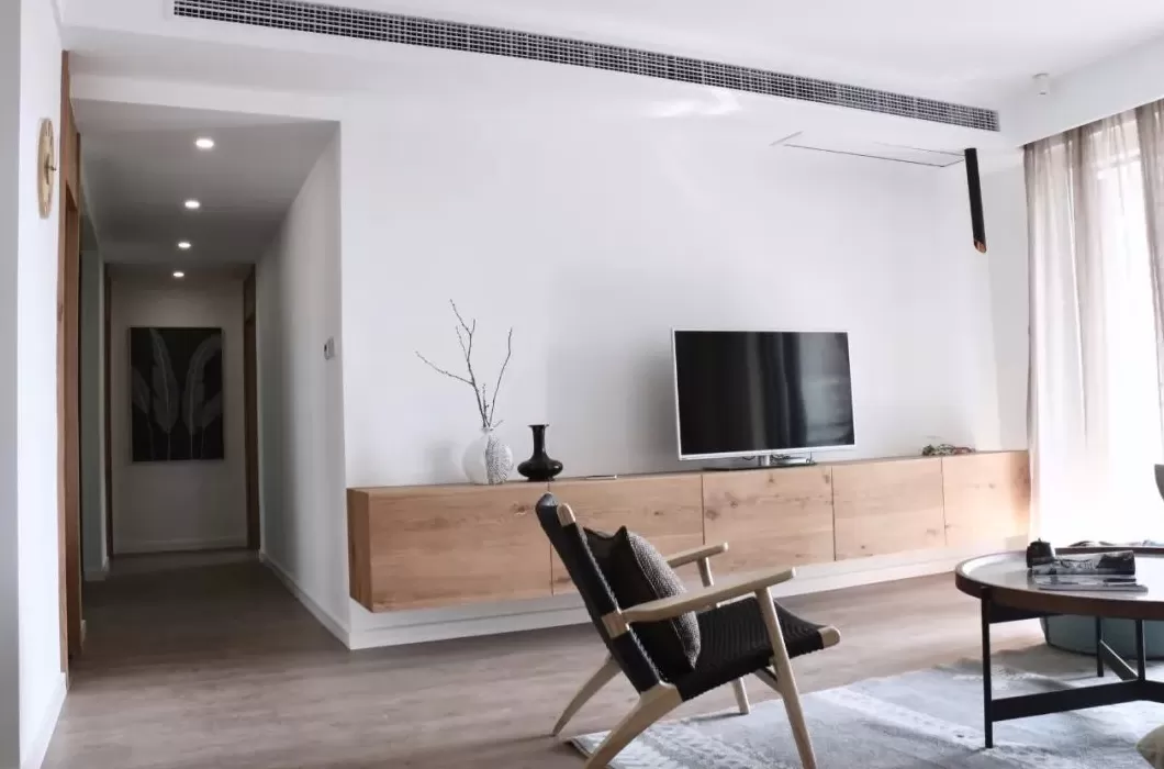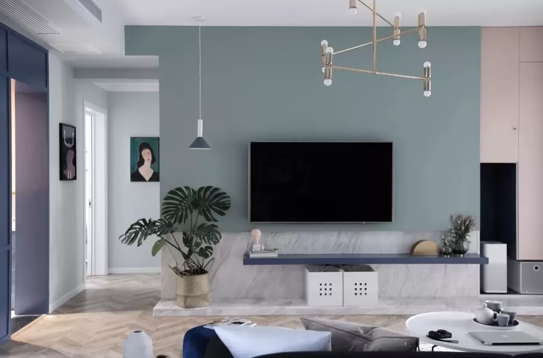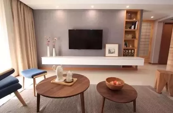 最为简单的做法就是在简洁的电视墙上壁挂电视机,然后再布置上成品电视柜或根据电视墙定制一个电视柜,整体设计感就简洁而又大气了。
