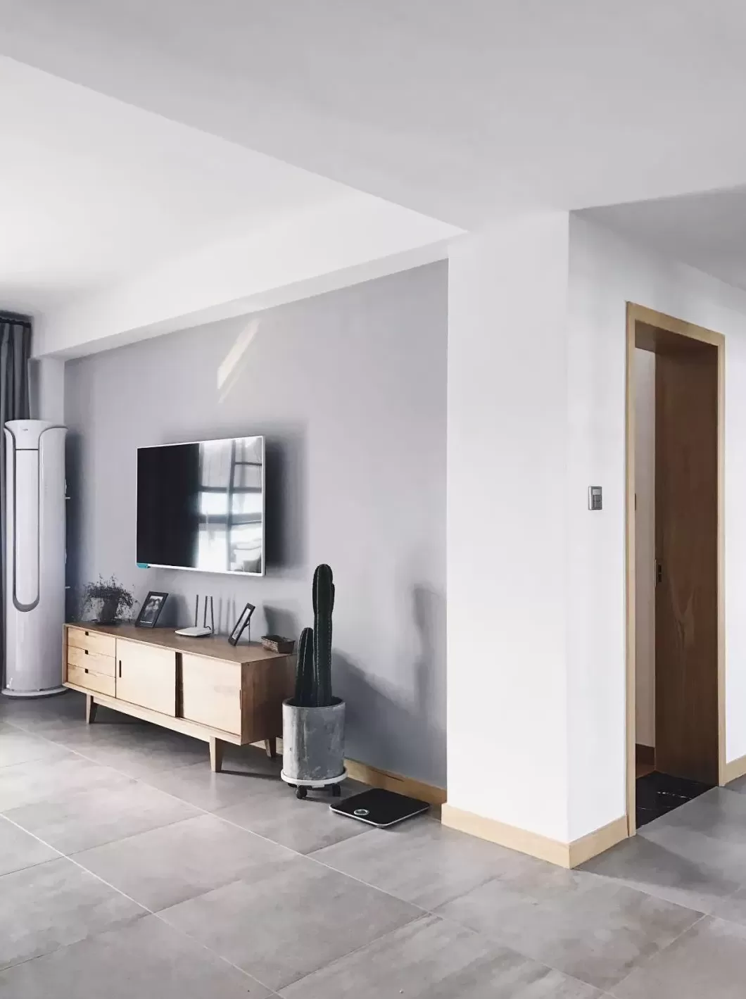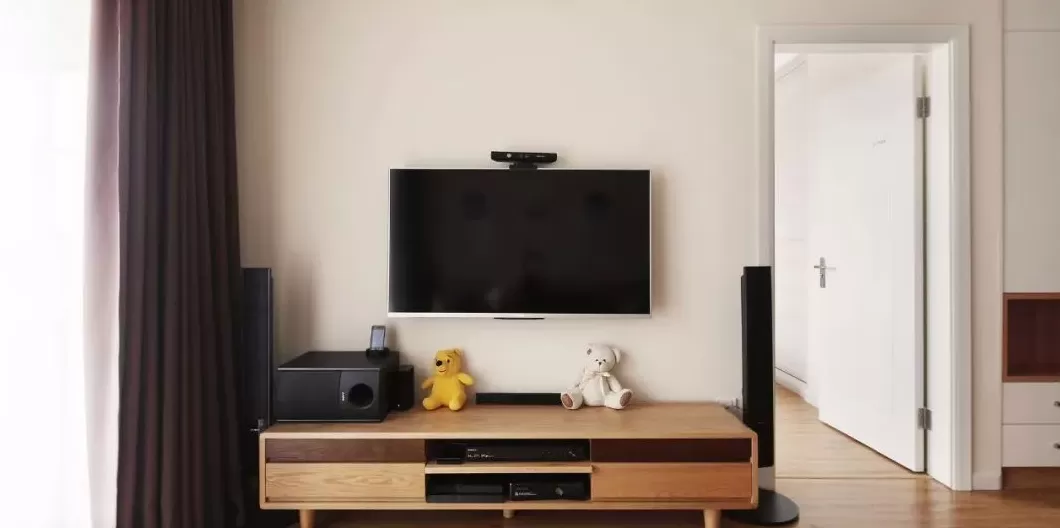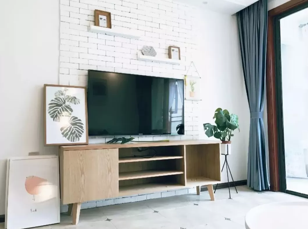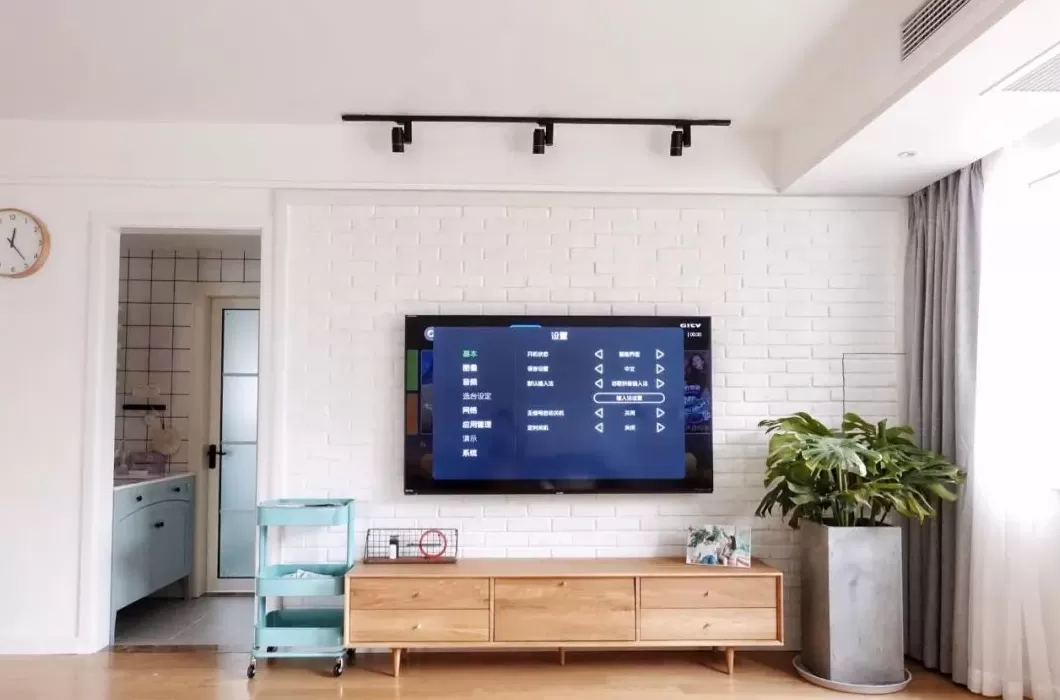如果是立式的落地空调,或是喜欢影音设备的,那么空调或音响设备分布在电视柜旁边,成为一道实用的电视墙也很漂亮。