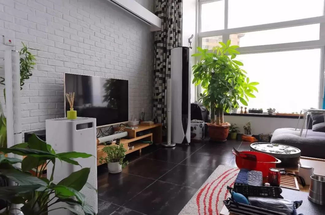 在电视柜上摆小盆绿植,电视柜旁边摆大盆落地盆植,以绿植让电视墙更加清新自然,使得客厅轻松舒适。