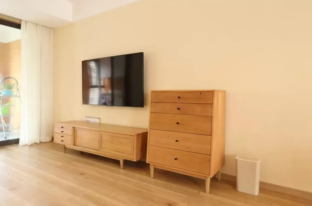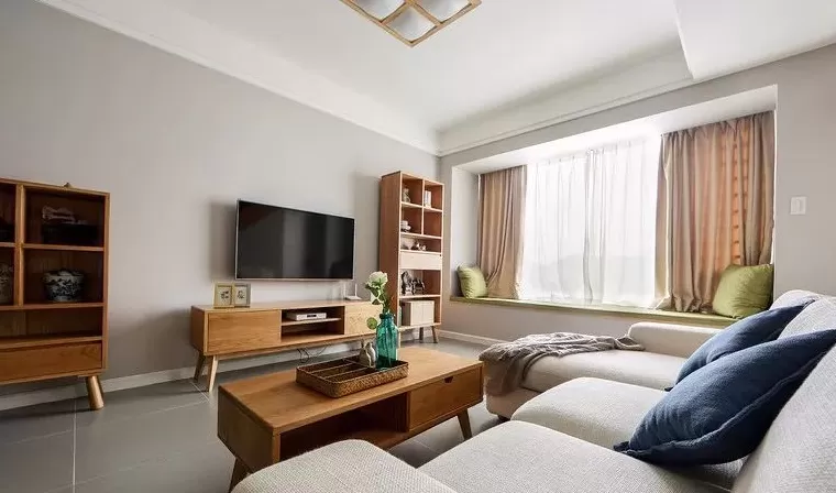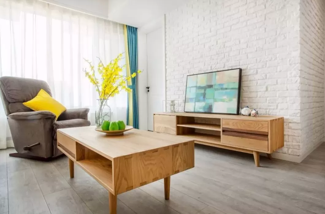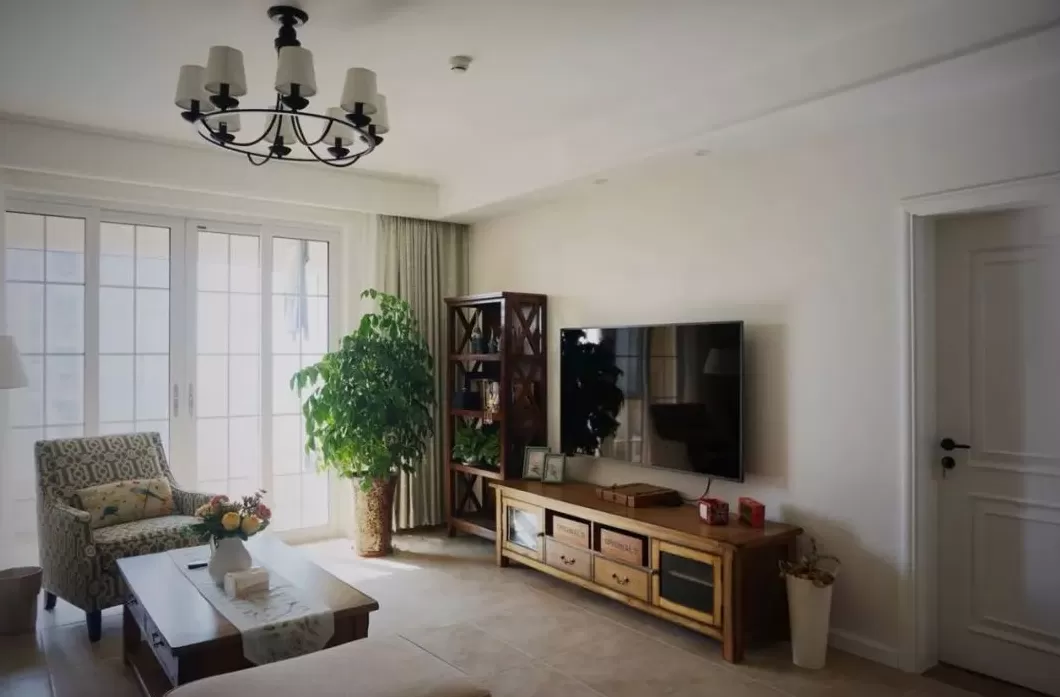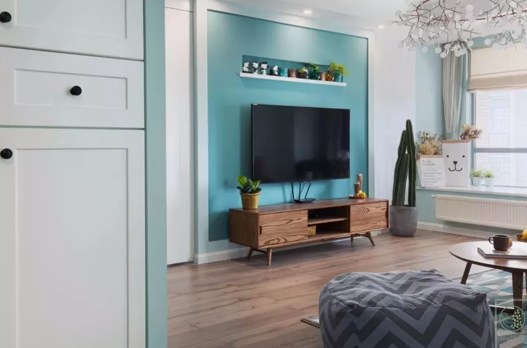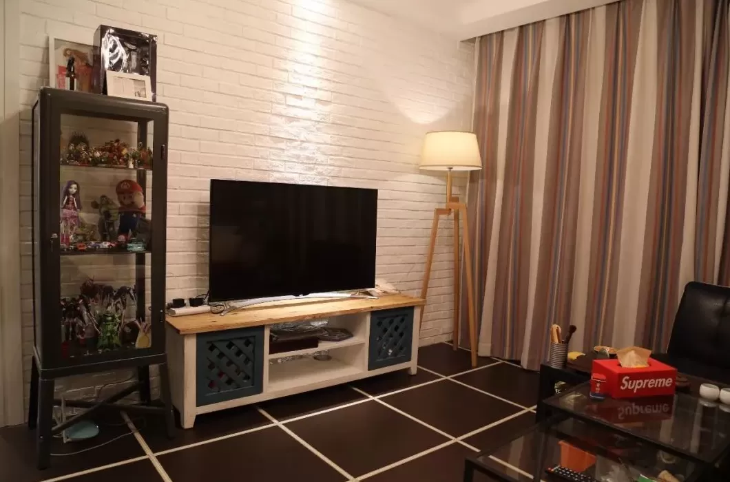 客厅空间的收纳位置不够,在电视柜旁放多一个小斗柜,丰富了电视墙的单调设计,又带来了实用的收纳储物。