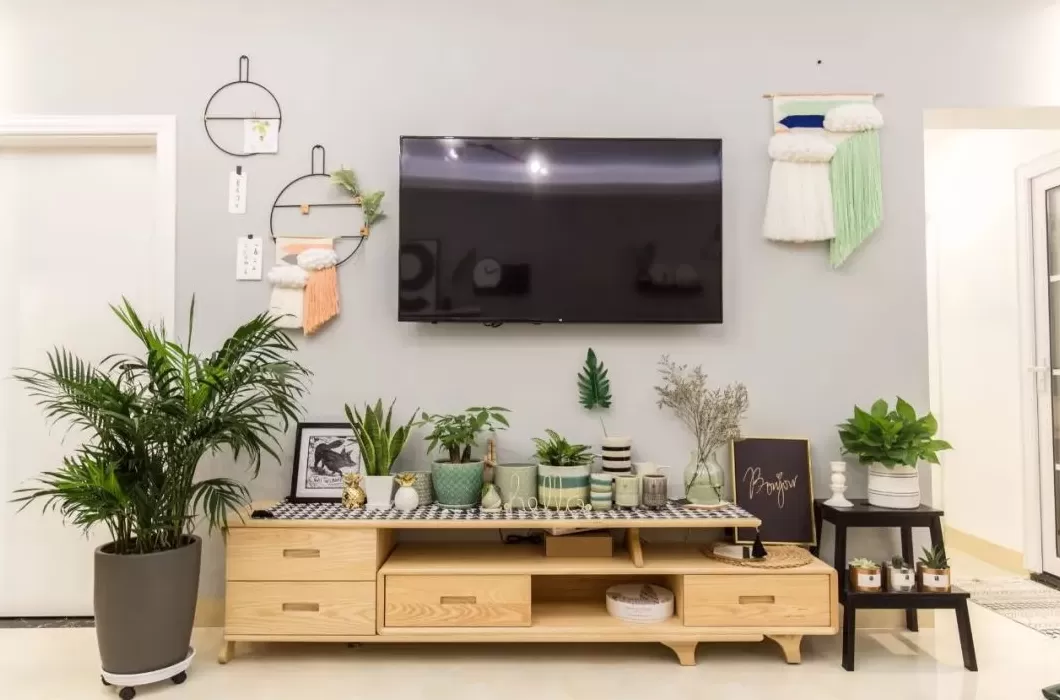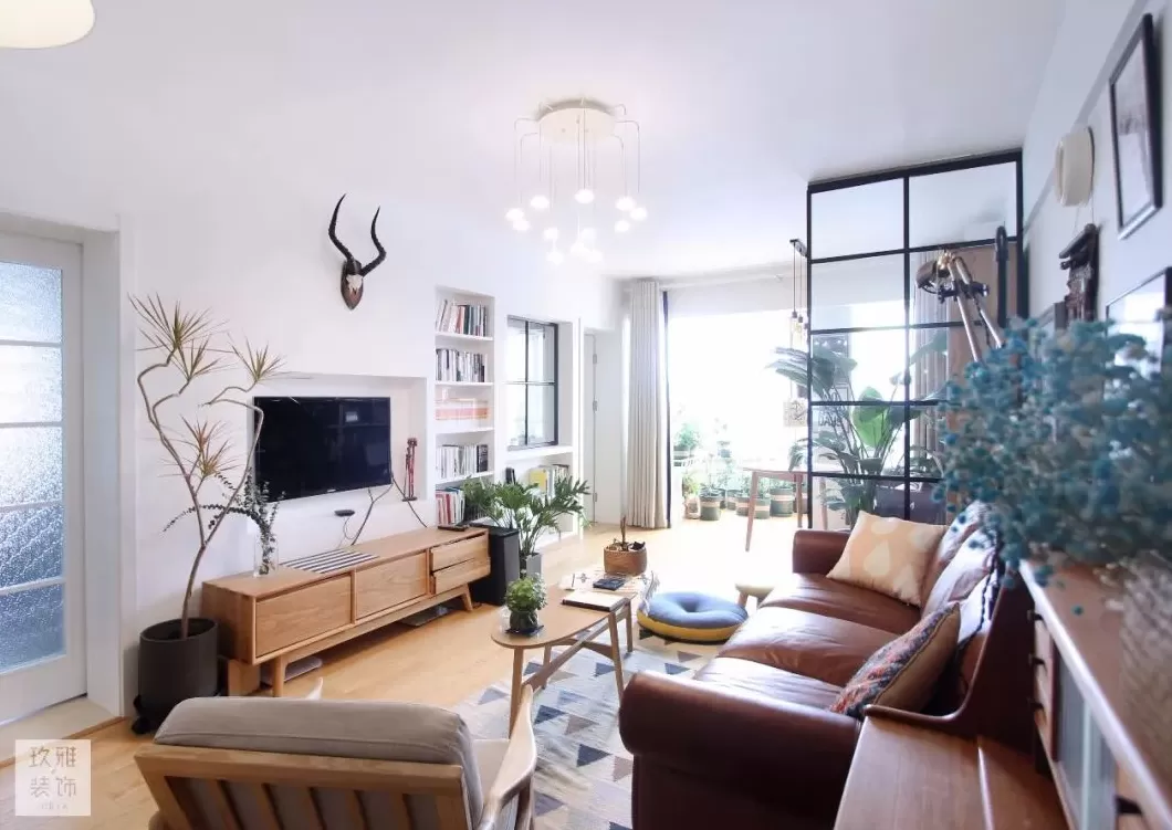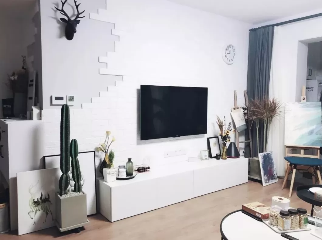 在摆设绿植的电视墙基础,再布置上装饰画与有趣的展示品,也是能让客厅更加文艺温馨。