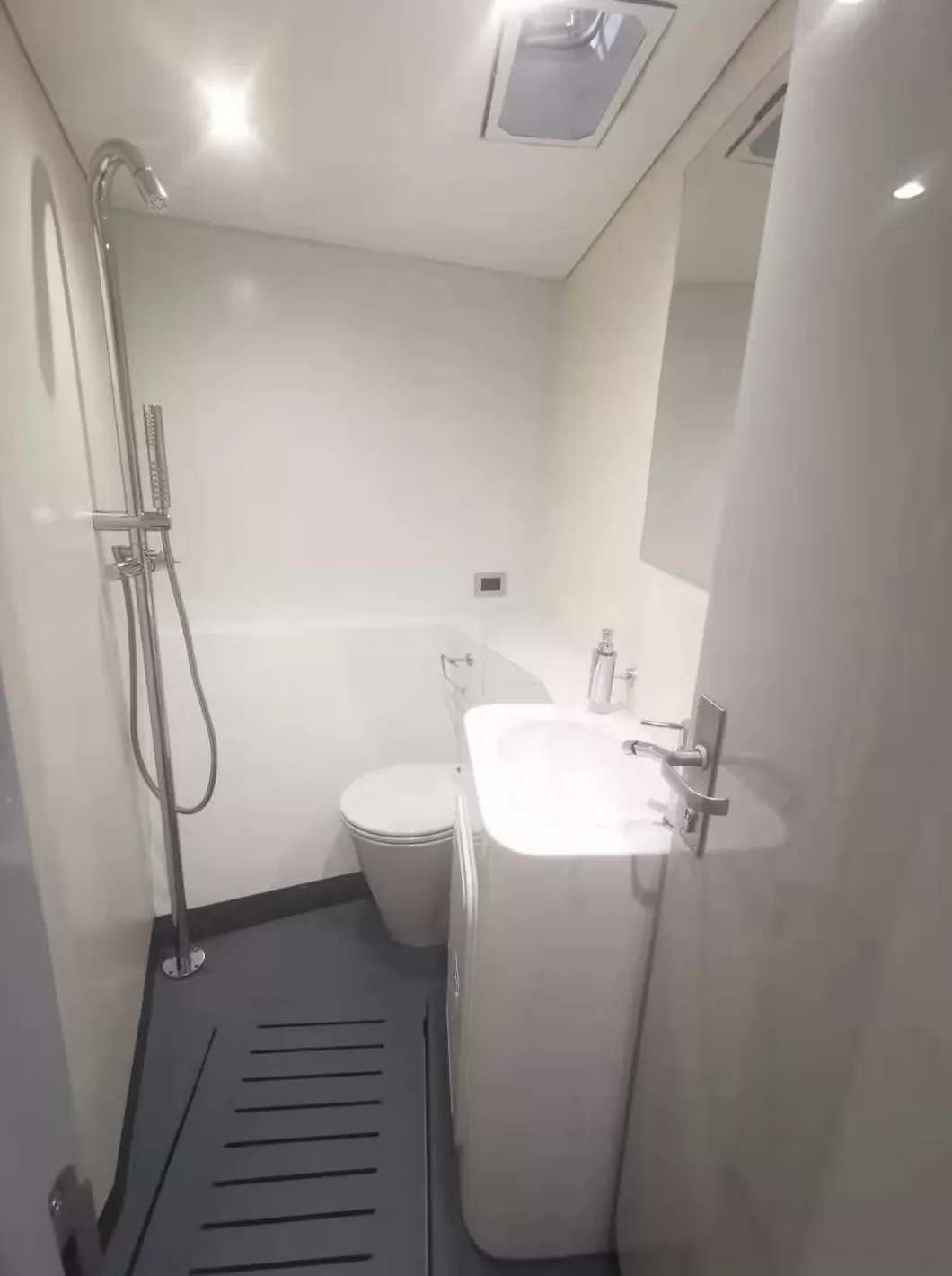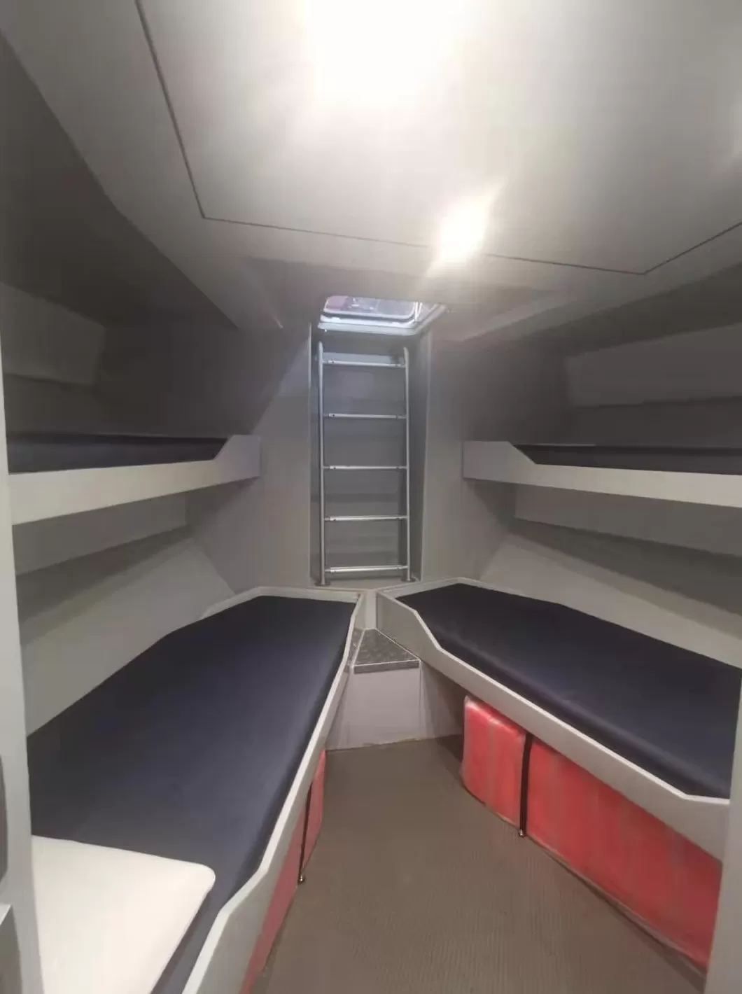 前舱有两个上下铺,且位置错开,可以让下铺的人也能享受到照明和宽阔的视野。床铺前方还有一个紧急逃生出口。