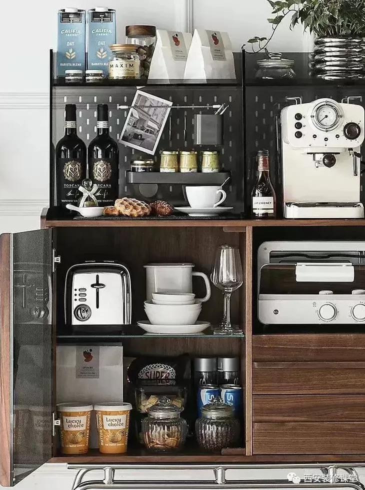 ▲矮柜定制,一般是靠近厨房或者有下水的地方,可以安置水槽,随手清洗杯子茶具非常方便;台面上饮水机、咖啡机、保温壶,墙面置物架子,可以满足随手拿取的各种水杯、咖啡杯的放置;下方地柜抽屉分类收纳,茶叶、咖啡各种冲泡饮品都可以分类放置;如此一个完整的水吧台,装修之初至少需要满足空间以及水电的要求,重点是洗涤水池的满足,必须有附近下水可以引导满足