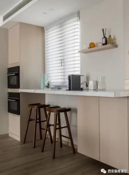 ▲水吧台顾名思义肯定有水,不论有没有水池,平时避免不了台面会有水,甚至各种高温电器水杯的放置,所以台面最好使用可以耐擦洗,耐高温的石英石台面,可以和家里厨房做一个颜色,特别是水吧台在厨房门口的布局,颜色台面统一也不会凌乱