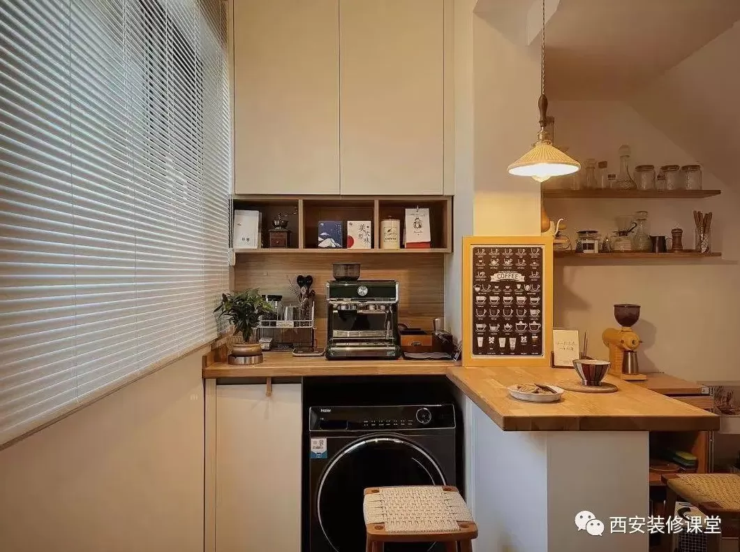 ▲阳台也可以作为水吧台的功能区,甚至下方不影响洗烘机的布局;定制吧台满足水吧台的功能区延伸,吊柜布局可以满足 各种收纳零碎