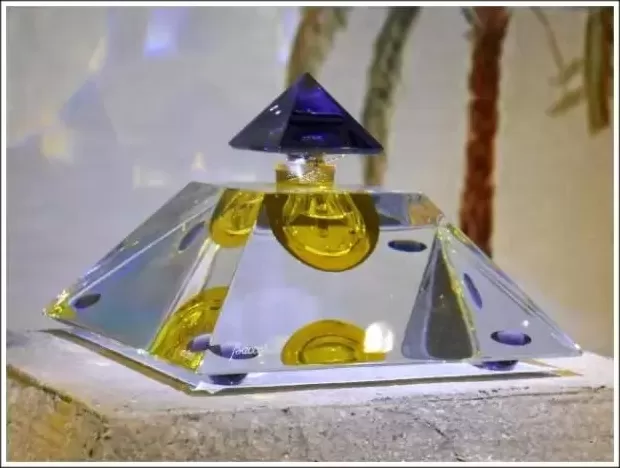 Baccarat 作为顶级水晶制造商,其香水瓶自然是其核心卖点。这款香水瓶设计成金字塔形状,瓶盖也是一个精巧的尖顶,放在一个同样金黄色的盒子里。它的名字“圣泪”也充满诗意。这种设计将埃及文化的神秘与水晶的剔透完美融合,同样以每盎司的价格计算,强调了其高端品质。