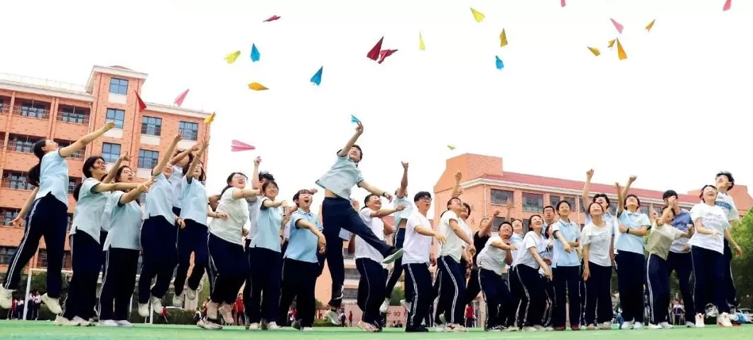 2025年5月22日,山东高密市第五中学,高三学生将写有梦想的纸飞机抛向空中。图/新华